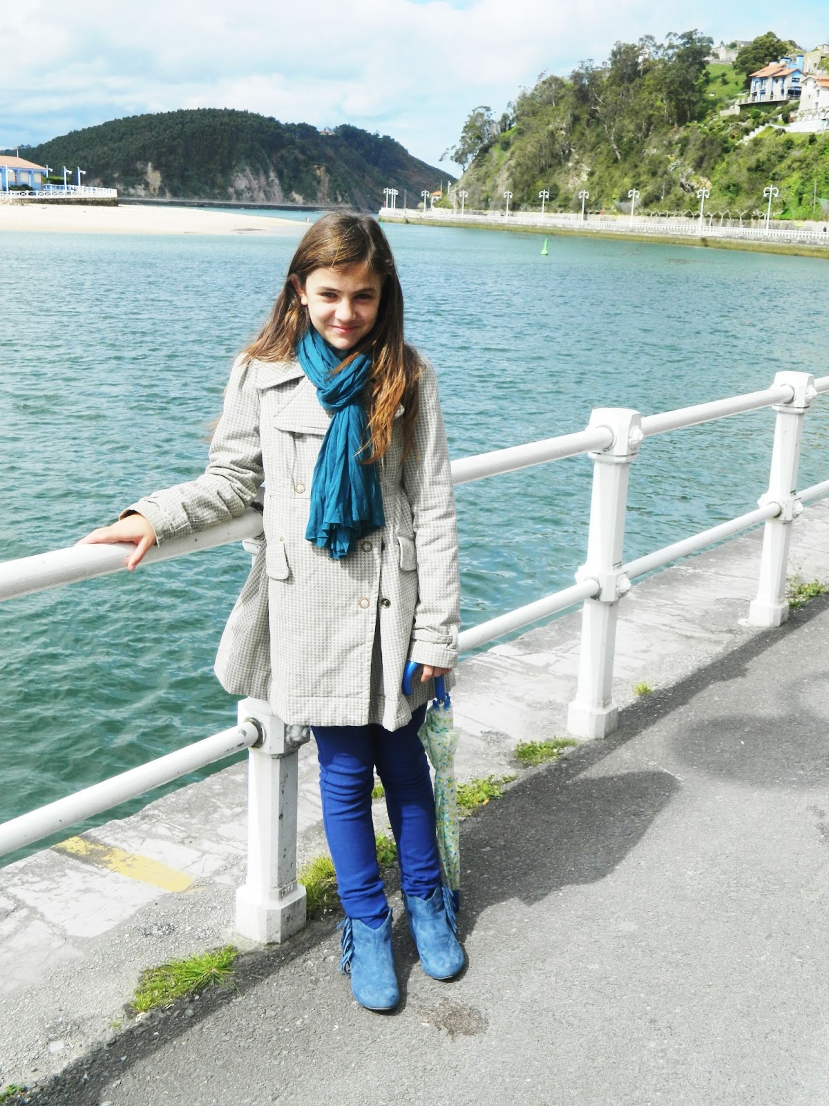 Lleva camiseta interior de MAYORAL, pantalones azules tipo jeggins y pañuelo del mercado ambulante del pueblo, botas MUSTANG, abrigo de RIP CURL y paraguas de TÉ & NARANJA.